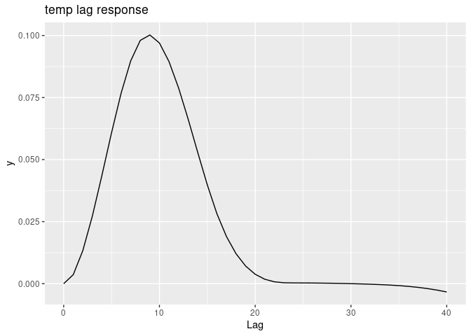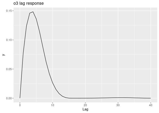 Here, we specified that “temp”, “pm10” and “o3” should be treated longitudinally, using the “dynamic_vars” argument. The “lag” argument specifies the number of lags that we wish to fit to the model (in this case, 40 time units). We use the “arglag” argument to define the lag-response; in this case we use a b-spline with 7 degrees of freedom. Note that, besides the response variable “death”, we also have a variable “season” which we did not specify as a dynamic variable; this instead will be treated as a static (i.e., non-longitudinal) in the model, as will the intercept.