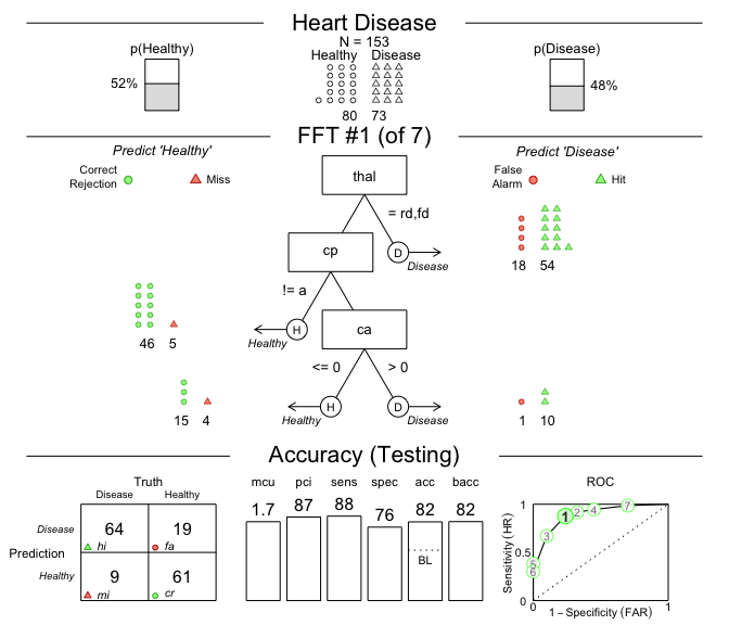Figure 1: A fast-and-frugal tree (FFT) predicting heart disease for test data and its performance characteristics.