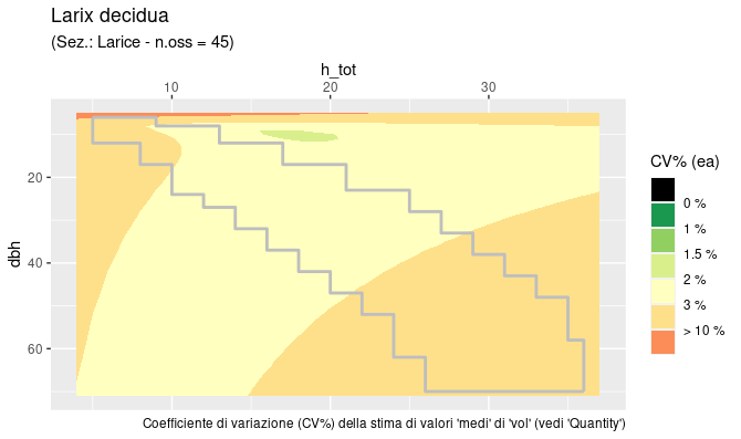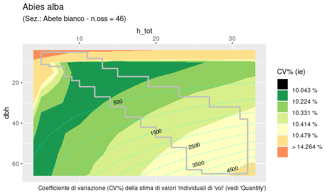 This region is the “domain” of the reliable estimates, based on the distribution of the sample trees used to calibrate the functions. The coefficient of variation (CV = standard_deviation / estimate) is computed and plotted (as ‘filled contours’) for the whole rectangular area, the limits of the region of reliable estimates (the “domain”), is superimposed as a light coloured line. Function output is a ggplot object that can be used by itself or as a background on top of which the user can plot his/her data to verify eventual accuracy or reliability problems.