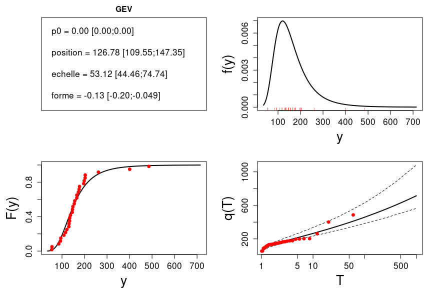 Deux fonctions sont fournies pour une estimation interactive Q=f(T) (quantile pour une période de retour donnée) ou T=f(Q) (période de retour associée à une valeur). Dans les deux cas le résultat inclut un intervalle d’incertitude.