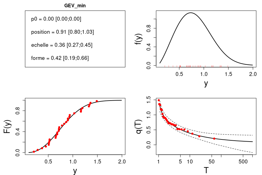 Lorsqu’on s’interesse aux extrêmes bas (basses eaux par exemple), les grandes périodes de retour sont associées aux petites valeurs! Il faut alors modifier les options d’estimation par defaut comme illustré ci-dessous. Notez l’inversion de la courbe des quantiles.