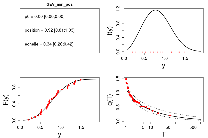 Une difficulté souvent rencontrée est que les quantiles de grande période de retour deviennent negatifs, ce qui est génant pour des débits. La distribution ‘GEV_min_pos’ est une ‘GEV_min’ modifiée pour toujours rester strictement positive.