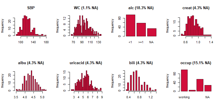 JointAI also provides functions for exploration of the distribution of the data and missing values, export of imputed values and prediction.