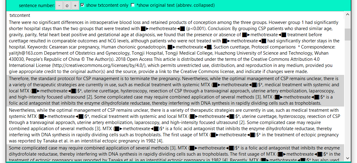 1. Show original text (abbreviations collapsed): Choosing this setting will restore the orginial sentences by replacing ABBREVIATION (search word)$* with ABBREVIATION, e.g., MTX (Methotrexate)$* with MTX.