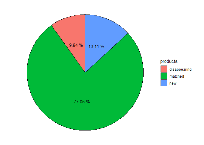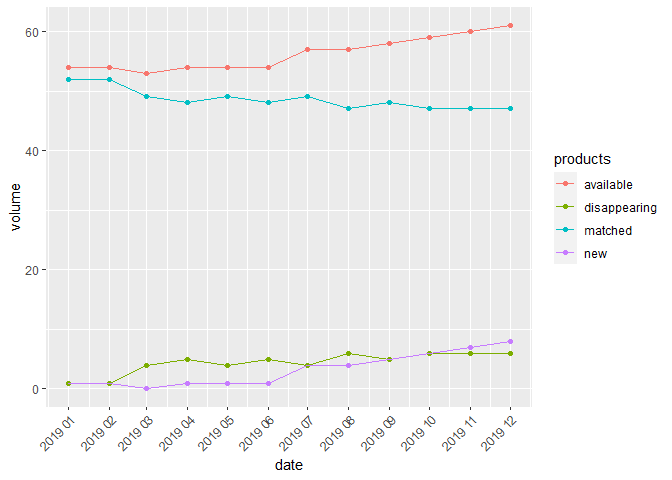 The second one, dataMATCH, can be used to demonstrate the data_matching function and it will be described in the next part of the guidelines. Generally, this artificial data set contains the following columns: time - dates of transactions (Year-Month-Day); prices - prices of sold products; quantities - quantities of sold products; codeIN - internal product codes from the retailer; codeOUT - external product codes, e.g. GTIN or SKU in the real case; description - descriptions of sold products, eg. ‘product A’, ‘product B’, etc.