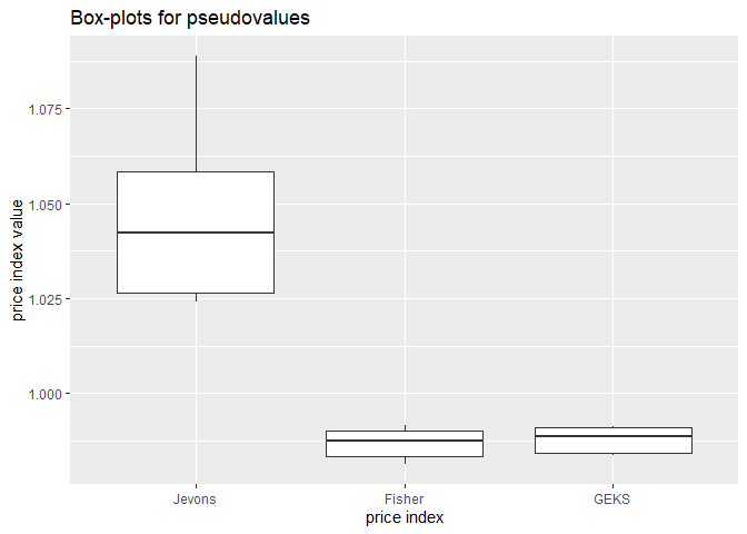 This function presents a comparison of selected indices obtained by using the jackknife method. In particular, it returns a list with four elements: iterations, which is a data frame with basic characteristics of the calculated iteration index values (means, standard deviations, coefficients of variation and results for all sample), pseudovalues, which is a data frame with basic characteristics of the calculated index pseudovalues obtained in the jackknife procedure (i.e. the jackknife estimators and their standard deviations and coefficients of variation), figure_iterations which presents a box-plot for the calculated iteration index values, and figure_pseudovalues which presents a box-plot for the calculated index pseudovalues obtained in the jackknife procedure. Please follow the example, in which the Jevons, Fisher and GEKS indices are compared by using the jackknife method: