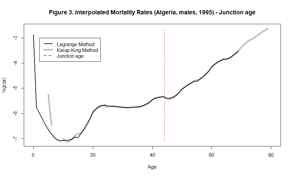 Mortality rates are typically provided in an abridged form, i.e., by age groups 0, ‘[1, 5]’, ‘[5, 10]’, ‘[10, 15]’, and so on. Some applications require a detailed (single) age description. Despite the enormous number of suggested techniques in the literature, only a few solutions provide good results at both younger and older ages. For example, the 6-term ‘Lagrange’ interpolation function is appropriate for mortality interpolation at younger ages (with irregular intervals), but not at older ages. The ‘Karup-King’ method, on the other hand, works well for older age groups but is not appropriate for younger ones. Shryock, Siegel, and Associates (1993) provide an in-depth description of the two methods mentioned.The Q2q package combines the two approaches, allowing for interpolation of mortality rates over all age groups. Each approach is implemented independently, and the resulting curves are merged at the age at which the two partial curves show the smallest 5-age averaged error.