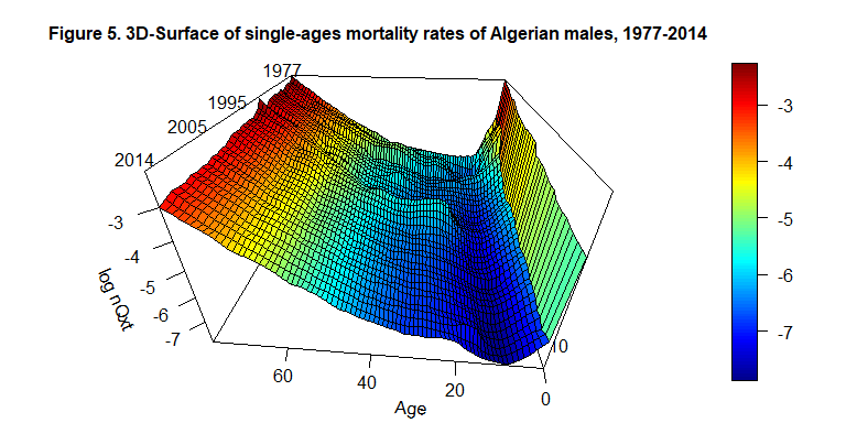 persp3D(x=c(0:79), y=c(1977:2014), z=log(interpolated_surface$qxt), phi = 30, theta = - 175, border = "black", facets = TRUE, inttype = 1, add = F, ticktype = "detailed", expand = .6, scale=1.5, r=.6, box=TRUE, xlab="Age", ylab=NULL, zlab="log nQxt", plot=F, axes=T , main="Figure 5. 3D-Surface of single-ages mortality rates of Algerian males, 1977-2014", cex.main=1 )