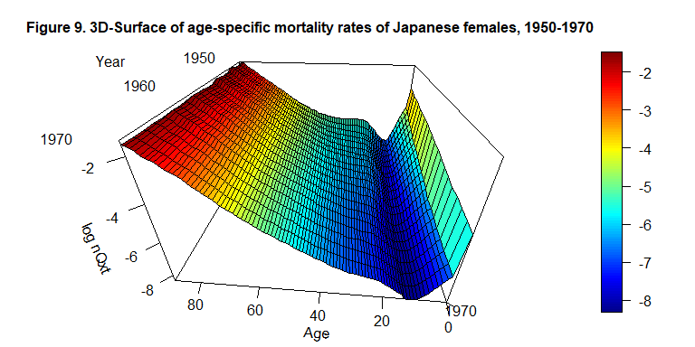 persp3D(x=c(0:89), y=c(1950:1970), z=log((LT_4_int$qxt)), phi = 30, theta = - 175, border = "black", facets = TRUE, inttype = 1, add = F, ticktype = "detailed", expand = .6, scale=1.5, r=.6, box=TRUE, xlab="Age", ylab=NULL, zlab="log nQxt", plot=F, axes=T, main="Figure 9. 3D-Surface of age-specific mortality rates of Japanese females, 1950-1970", cex.main=1 )