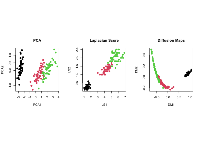 plot(mydfm$Y, pch=19, col=lab, xlab="DM1", ylab="DM2", main="Diffusion Maps")