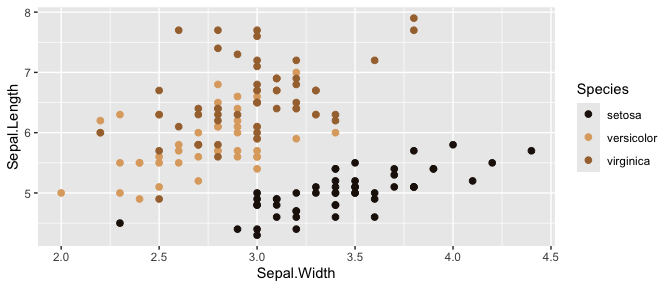 mapping = aes(x = Sepal.Width, y = Sepal.Length, color = Species)