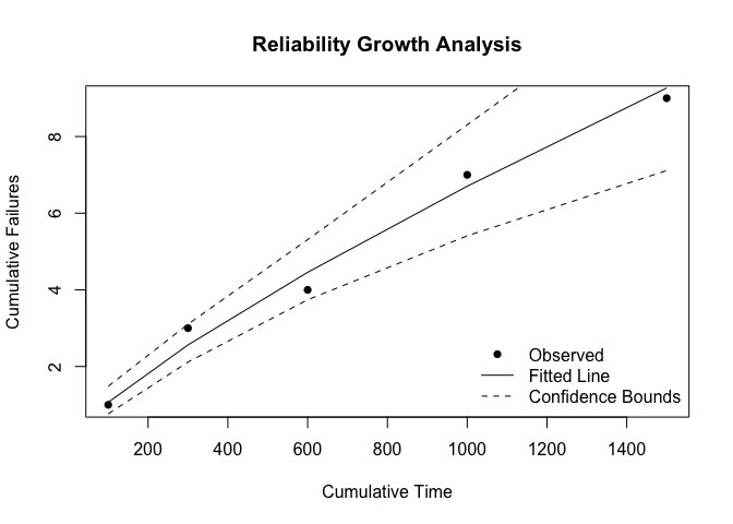 result plot(result, main = "Reliability Growth Analysis", xlab = "Cumulative Time", ylab = "Cumulative Failures")