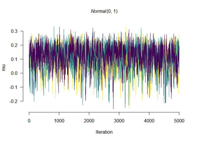 diagnostics(fit, parameter = "mu", type = "chains", show_models = 36)