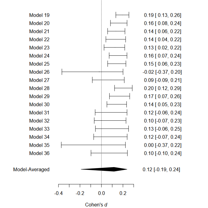 Then, we fit the meta-analytic model ensemble that is composed of 36 models (the new default settings of RoBMA fitting function). These models represent all possible combinations of prior distributions for the following components: