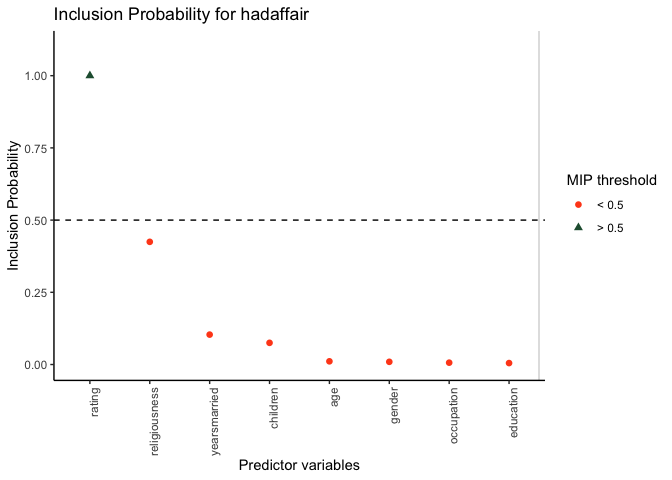 <- ssvs(data = Affairs, x = predictors, y = outcome, continuous = FALSE, progress = FALSE) results