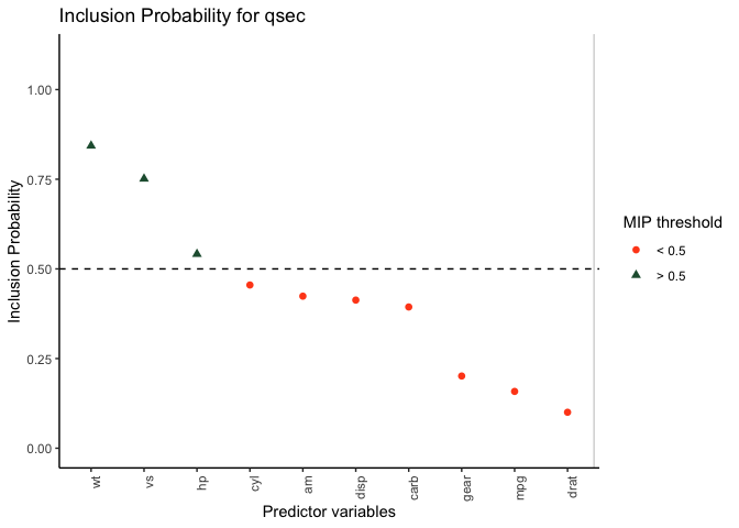 <- ssvs(data = mtcars, x = predictors, y = outcome, progress = FALSE) results