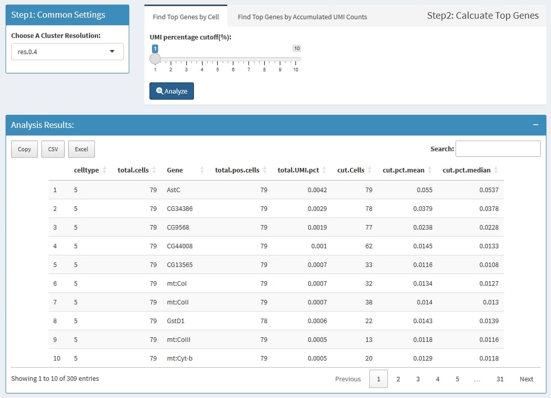 Step2: summary those genes for each cluster, firstly get all highly expressed genes in a cluster, some genes may has less cells, then for each gene, count cells in which this genes is highly expressed, and also calculate the mean and median UMI percentage in those highly expressed cells.