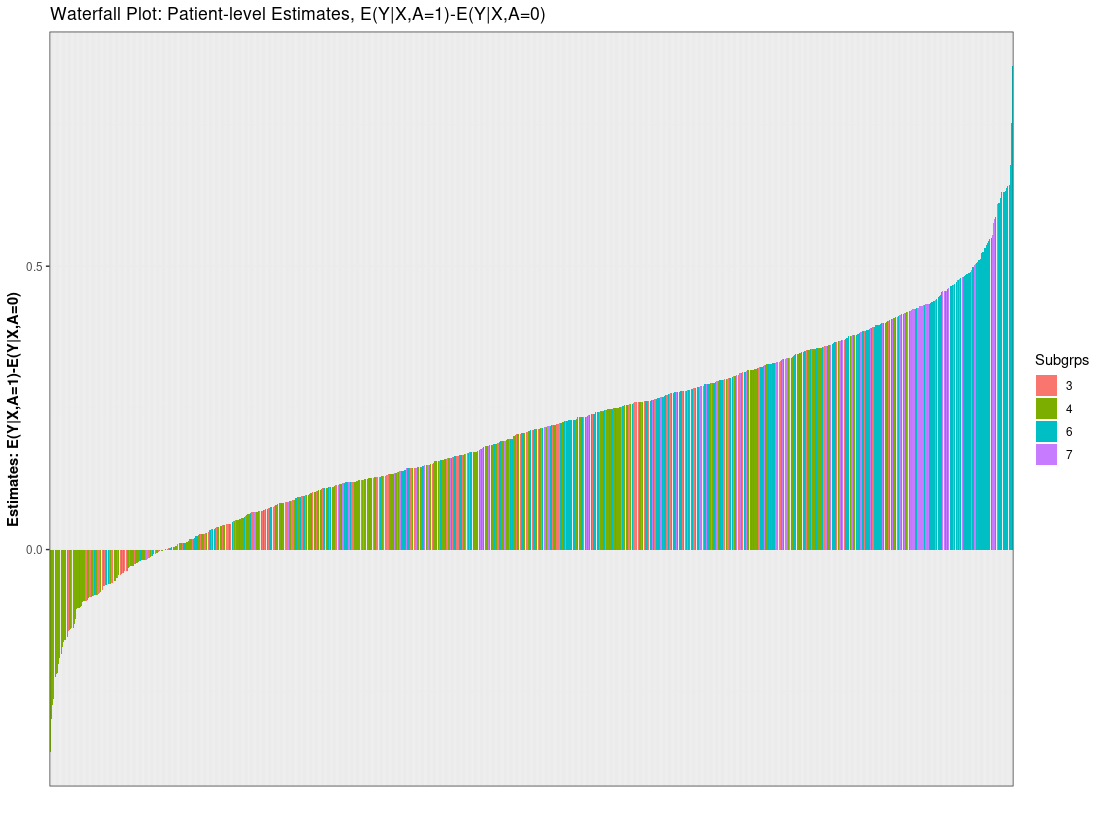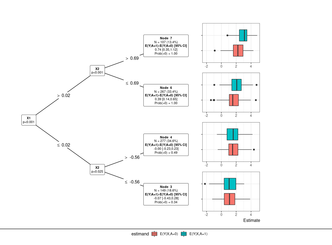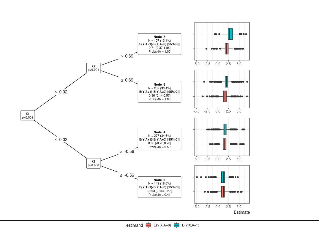 3. Subgroup model (submod_train): Tree-based models to identify groups with heterogeneous treatment effects. Based on initial subgroups (ex: tree nodes), we may also pool patients into “benefitting” and “non-benefitting” (see “pool” argument). With or without pooling, subgroup-specific treatment estimates and variability metrics are also provided.