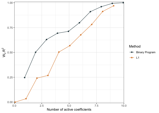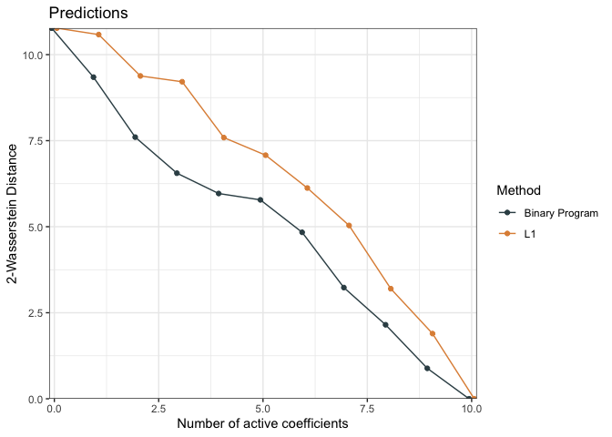 dc <- distCompare(models = list("L1" = fit.p2, "Binary Program" = fit.p2.bp),
