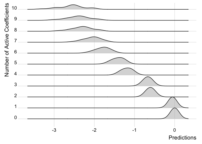 Note how the predictions get better the more coefficients are added and the distribution looks closer to the full posterior predictive.
