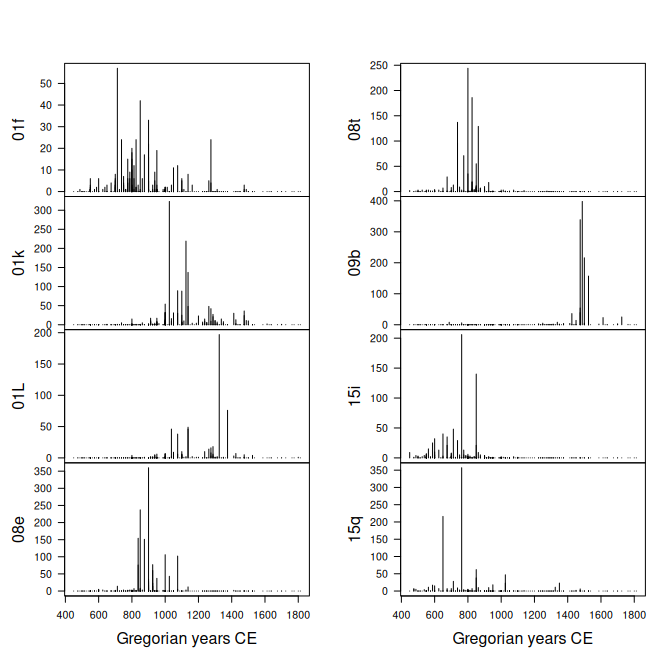 Base R ships with a lot of functionality useful for time series, in particular in the stats package. However, these features are not adapted to most archaeological time series. These are indeed defined for a given calendar era, they can involve dates very far in the past and the sampling of the observation time is (in most cases) not constant.