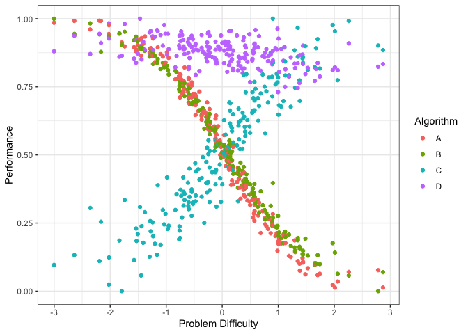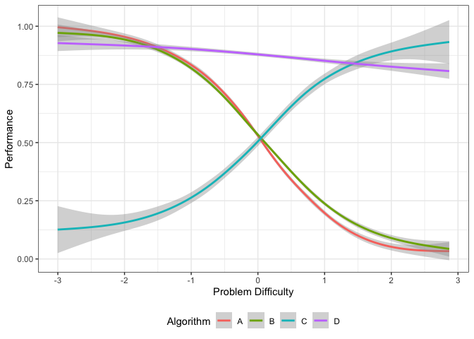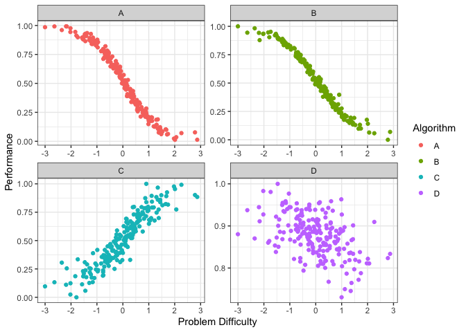 The figure above shows the performance of the 4 algorithms on different datasets ordered by dataset difficulty. Again, we see that the performance of algorithms A and B decrease with dataset difficulty while the performance of algorithm C increases with dataset difficulty. Even though the performance of Algorithm D somewhat decreases with dataset difficulty it is very consistent. We can plot it by algorithm (if the portfolio has lots of algorithms) by using plottype = 2.