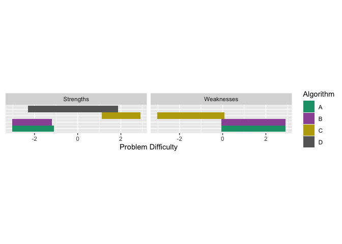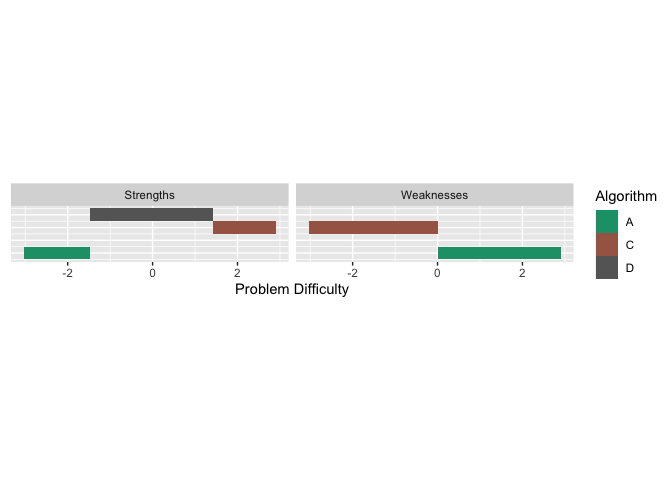 Now, all 4 algorithms have strengths. We see that the latent trait occupancy (proportion in the table above) of D has increased to 0.94, that is a large proportion of the problem space. And if we add up the proportions, the sum is greater than 1. This is because there is an overlap of strong algorithms in the latent trait. Let us look at the strengths and weaknesses plot.