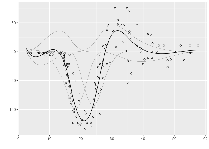 Below is an illustration of the A-spline procedure using the helmet data. The thick line represents the fitted spline and the thin line represents the B-spline basis decomposition of the fitted curve.