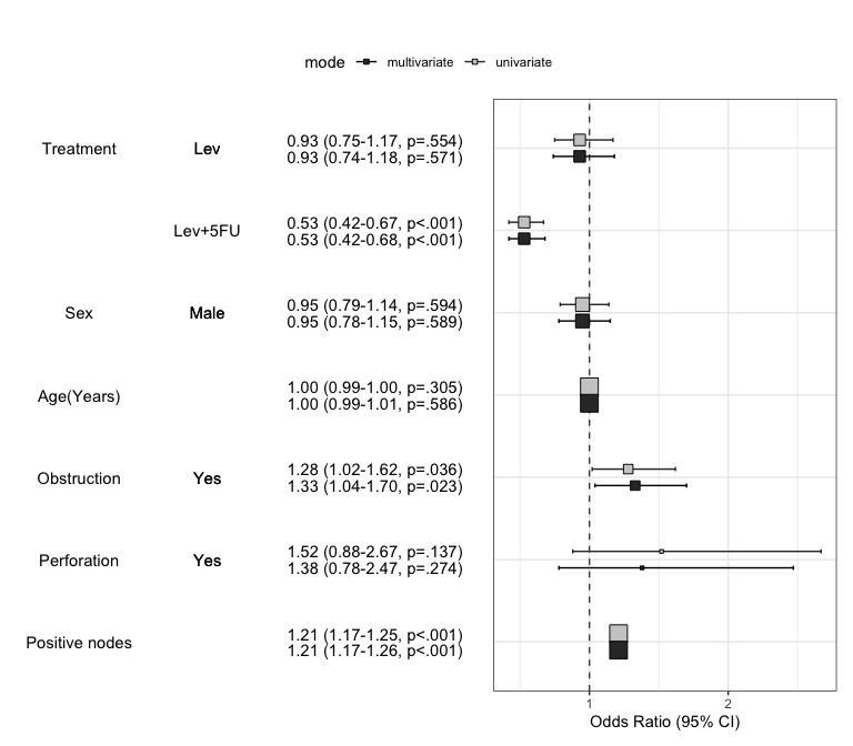 You can add the results of univariate analyses to the table. At this time, the autoReg() function automatically select explanatory variables below the threshold(default value 0.2) and perform multivariate analysis. In this table, the p values of explanatory variables sex.factor and age is above the default threshold(0.2), they are excluded in multivariate model.