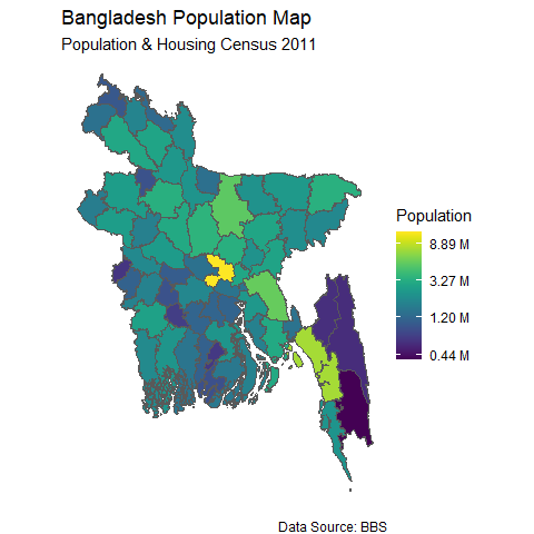We can also use ggplot2 and leaflet to draw customized choropleths with the sf objects provided in bangladesh package.