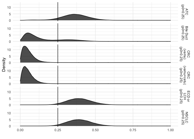 An analysis of the trial data can be reproduced by loading the vemu_wide data, which is included with the package. The data set includes the number of evaluable patients (column evaluable), the number of responding patients (column responders), and the associated baskets for the respective results (column baskets). The model is fit by passing these values to the basket() function along with an argument specifying the null response rate of 0.25 for evaluation of each basket. A visualization of the posterior distribution of the response rates can be created with the following and shows that the Bile Duct and CRC cohorts are similar and do not respond to treatment where ATC, ECD or LCH, and NSCLC do respond.