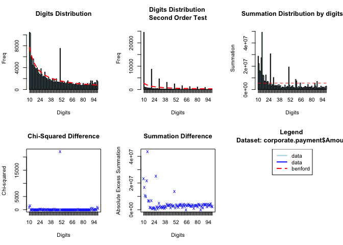 The Benford Analysis (benford.analysis) package provides tools that make it easier to validate data using Benford’s Law. The main purpose of the package is to identify suspicious data that need further verification.
