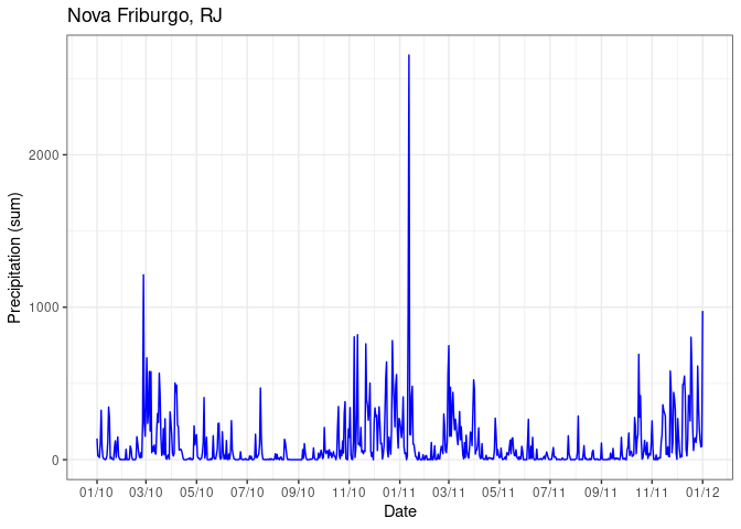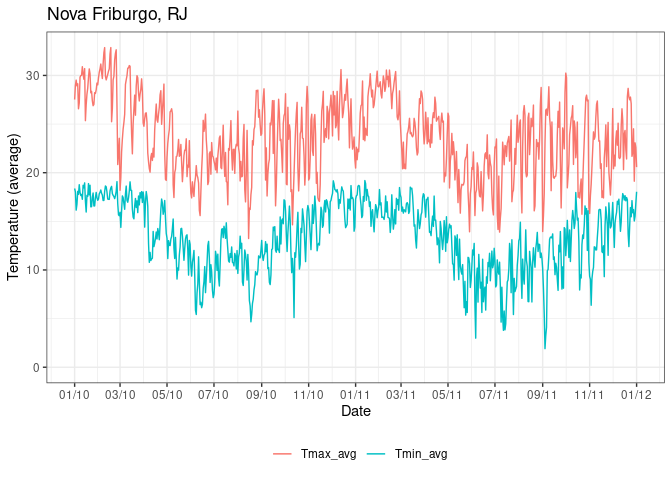 Zonal statistics such as mean, maximum, minimum, standard deviation, and sum were computed by taking into account the data cells that intersect the boundaries of each municipality and stored in Parquet files. This procedure was carried out for all Brazilian municipalities, and for all available dates, for every indicator available in the weather products (BR-DWGD and TerraClimate projects). This package queries on-line the already calculated statistics on the Parquet files and returns easy-to-use data.frames.