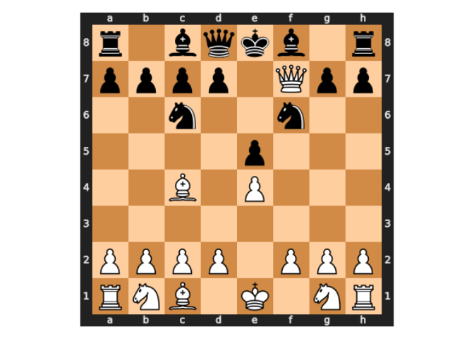 You can also create your own game with game() and add variations to it: the move() function adds moves as well as branches the tree of the game. Strings are converted to simple moves, while list()s behave exactly as parenthesis in PGN, creating a variation of the last move. Here you can see how to recreate a Scholar’s mate and some ways to avoid it: