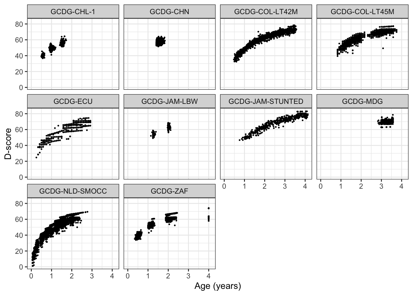 ylab("D-score") + xlab("Age (years)") +