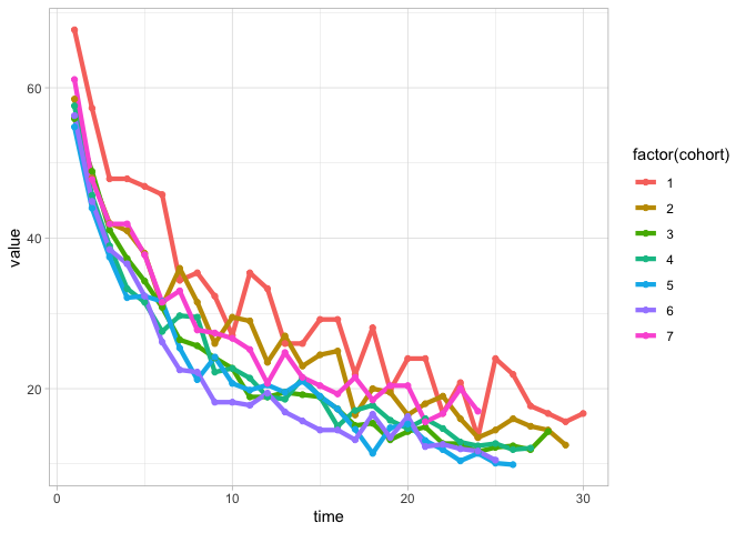 ggplot(aes(time, value, colour = factor(cohort), group = cohort)) +