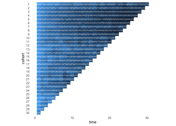 Another way to plot a cohort table is by means of tiles. In this case we provide the percentages and colour the tiles accordingly.