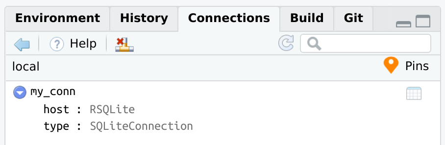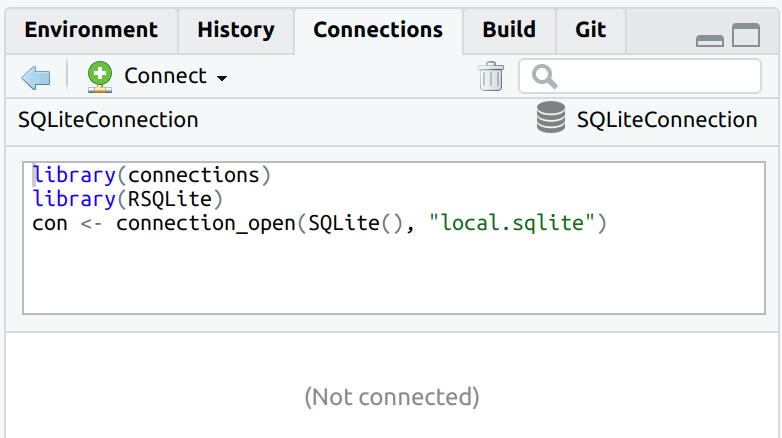 <- connection_open(SQLite(), "local.sqlite") con