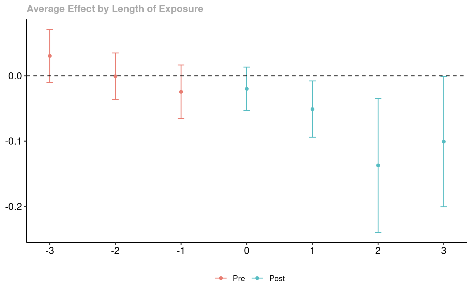 The event study above reported an overall effect of participating in the treatment. This was computed by averaging the average effects computed at each length of exposure.