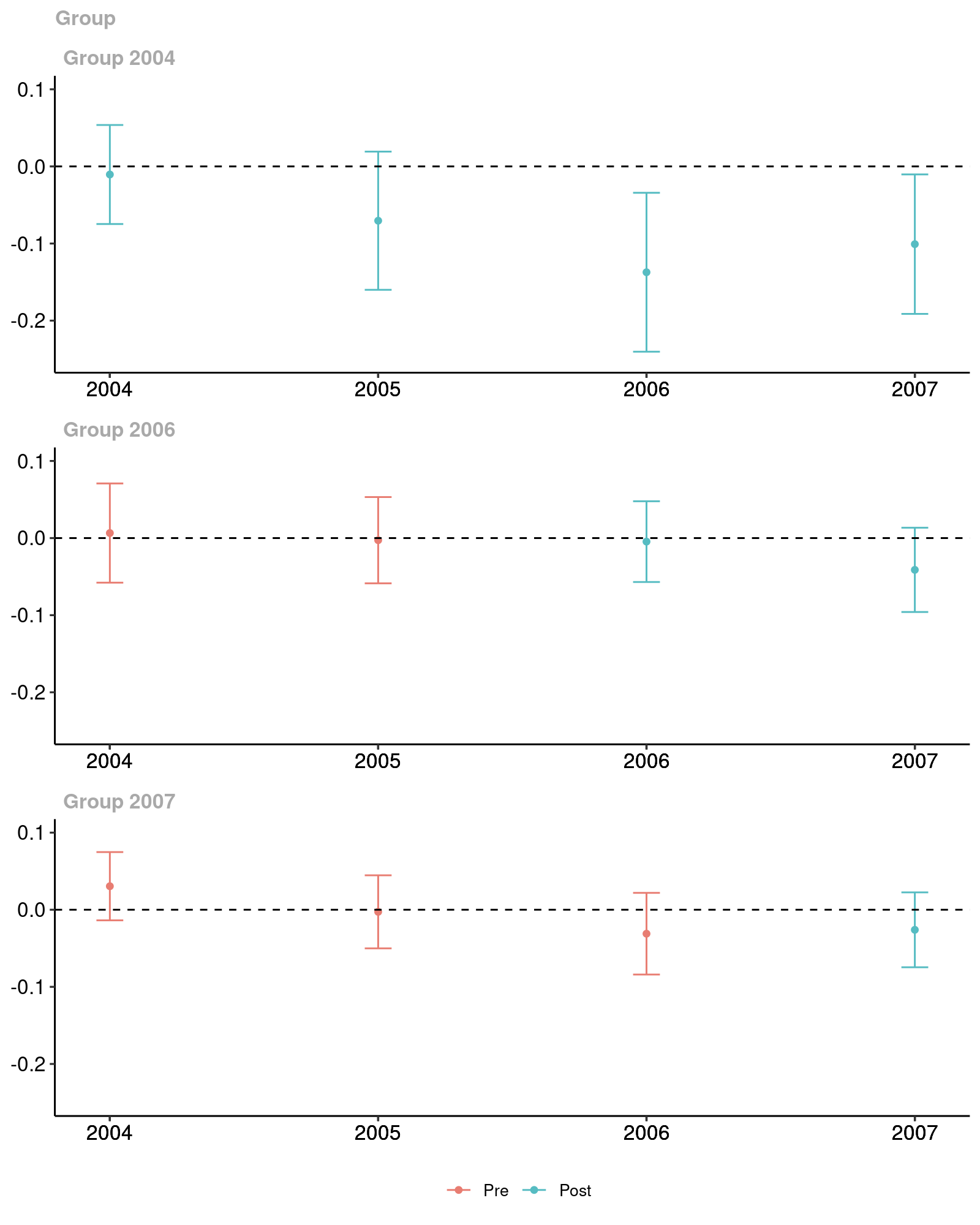 The red dots in the plot are pre-treatment group-time average treatment effects . Here they are provided with 95% simultaneous confidence intervals. These are the estimates that can be interpreted as a pre-test of the parallel trends assumption. The blue dots are post-treatment group-time average treatment effects. Under the parallel trends assumption, these can be interpreted as policy effects – here the effect of the minimum wage on county-level teen employment due to increasing the minimum wage.