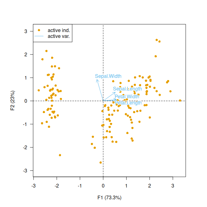 <- pca(iris, center = TRUE, scale = TRUE, sup_quali = "Species") X