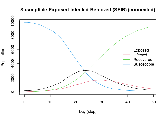 This R package includes several popular epidemiological models, including SIS, SIR, and SEIR using either a fully connected graph (similar to a compartmental model) or a user-defined network.