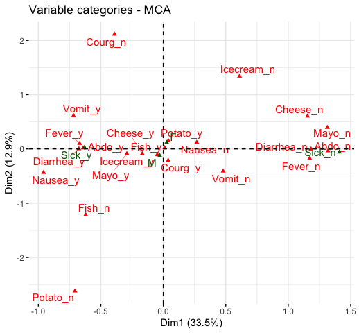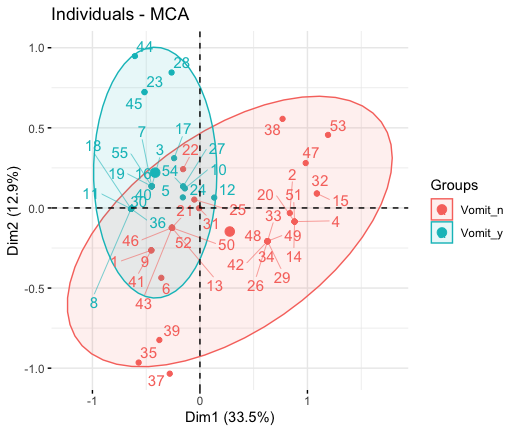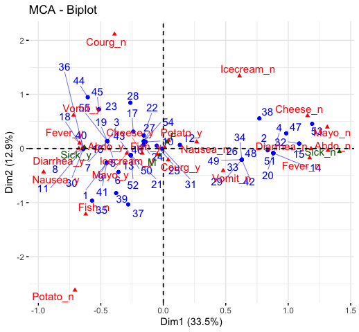 fviz_mca Graph of individuals/variables from the output of Multiple Correspondence Analysis (MCA).