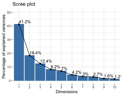 fviz_eig (or fviz_eigenvalue) Extract and visualize the eigenvalues/variances of dimensions.