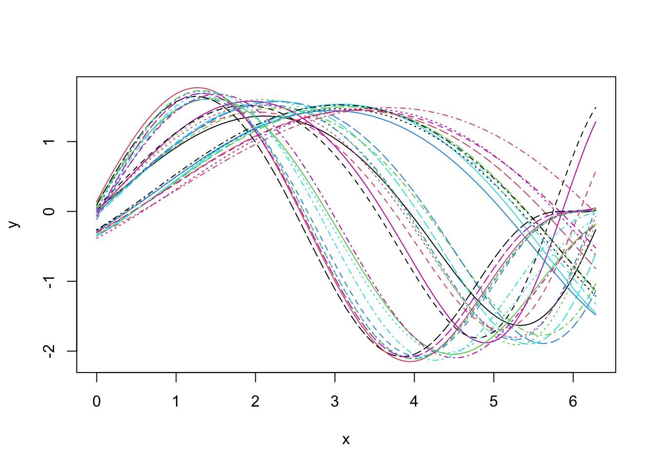 Let us consider the following simulated example of \(30\) \(1\)-dimensional curves: