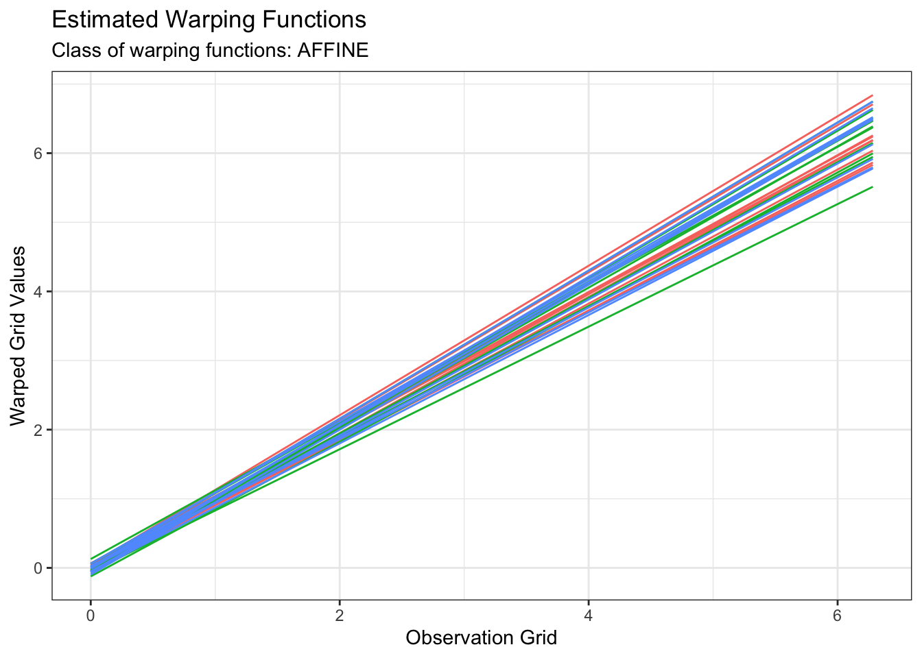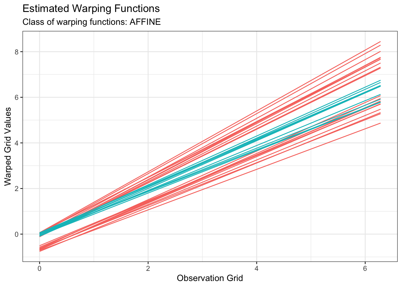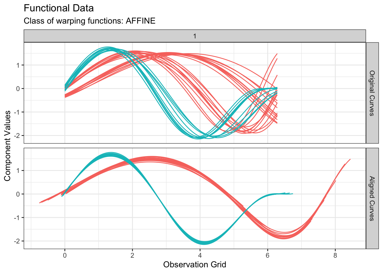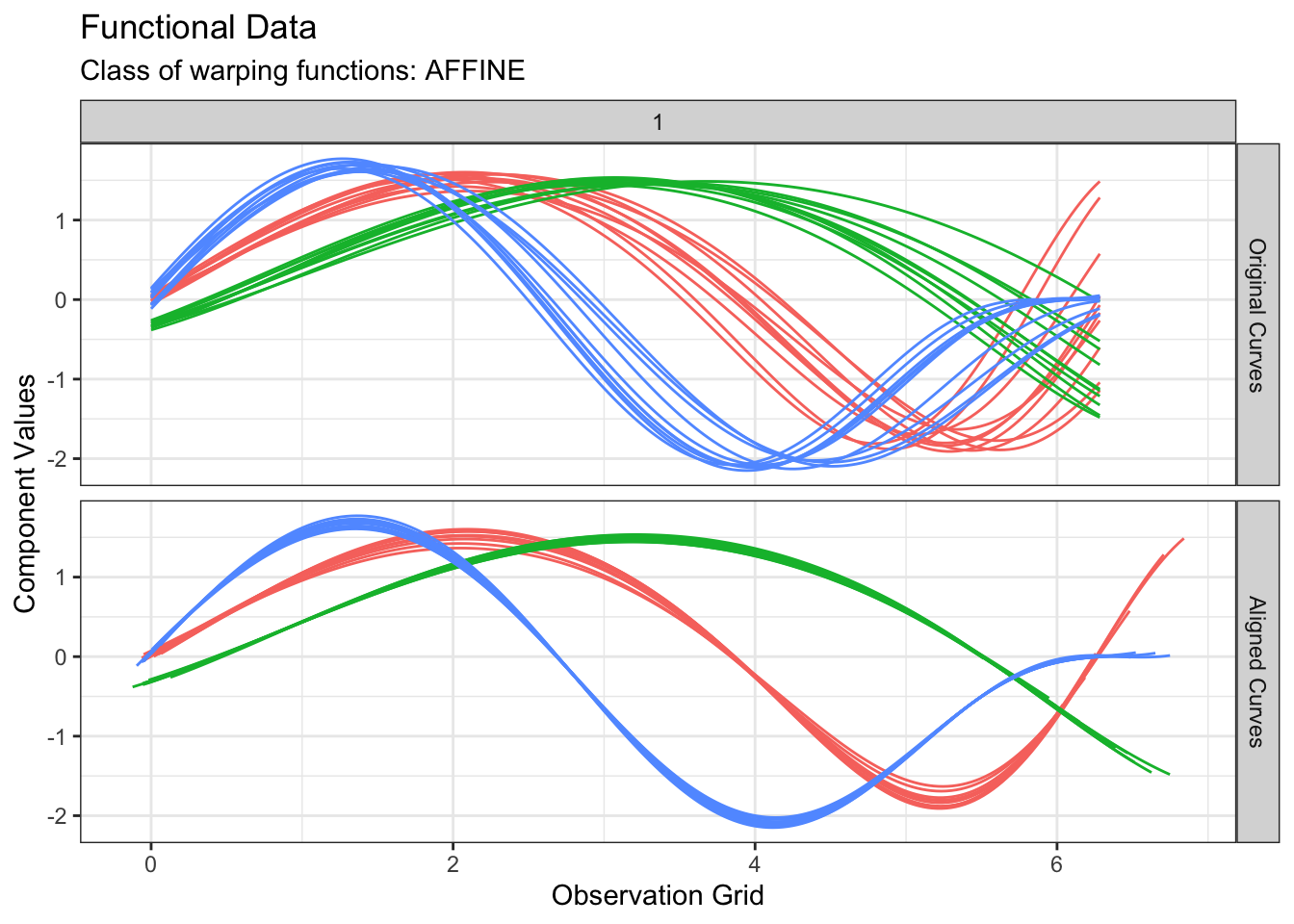 Looking at the data set, it seems that we shall expect \(3\) groups if we aim at clustering based on phase variability but probably only \(2\) groups if we search for a clustering structure based on amplitude variability.