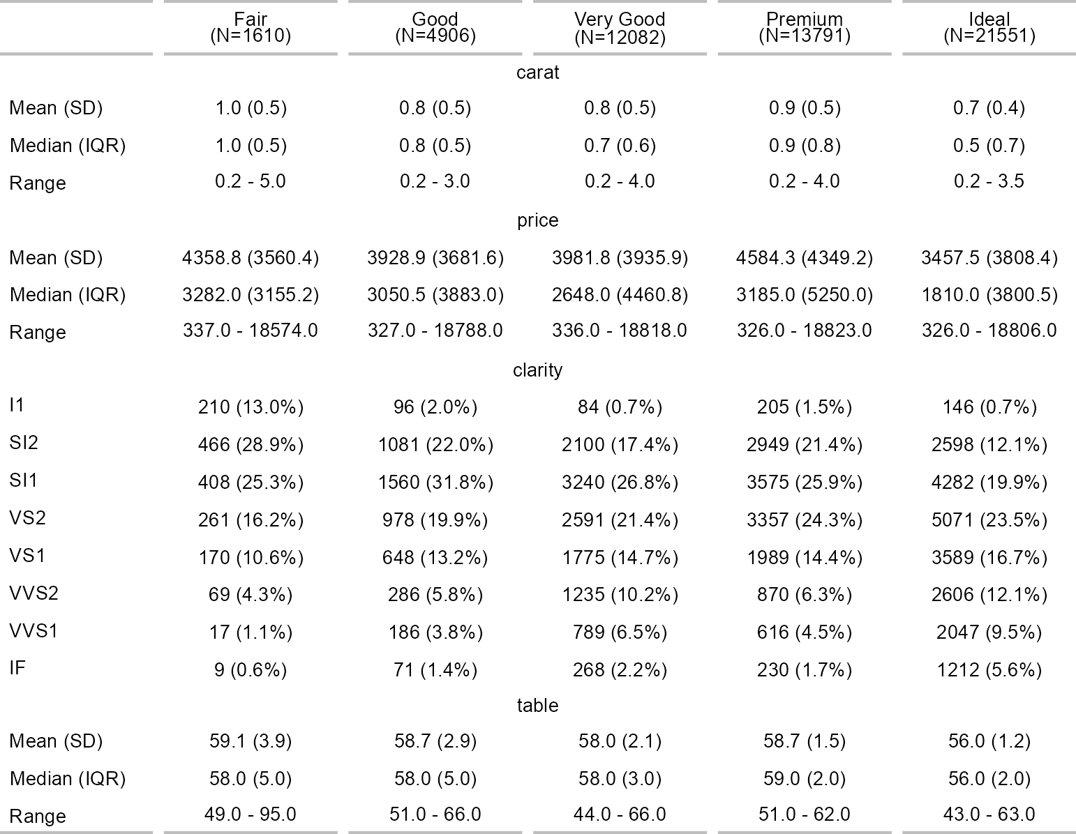 ::diamonds[, c("cut", "carat", "price", "clarity", "table")] |>