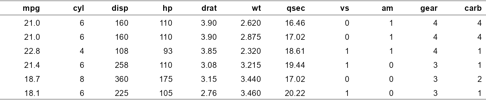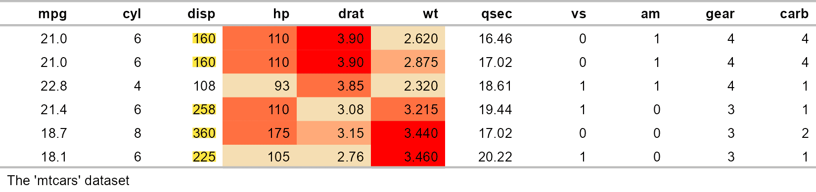 ft highlight(i = ~ mpg < 22, j = "disp", color = "#ffe842") |>
