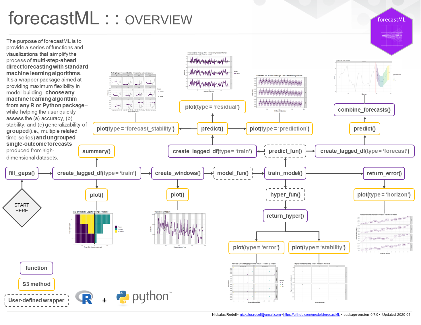 This package is inspired by Bergmeir, Hyndman, and Koo’s 2018 paper A note on the validity of cross-validation for evaluating autoregressive time series prediction. which supports–under certain conditions–forecasting with high-dimensional ML models without having to use methods that are time series specific.