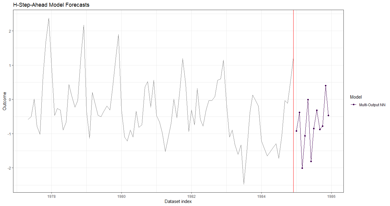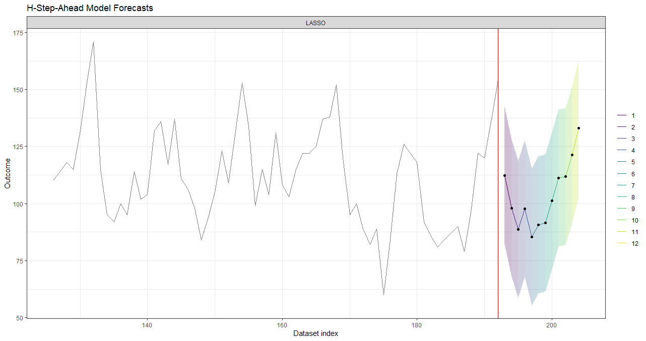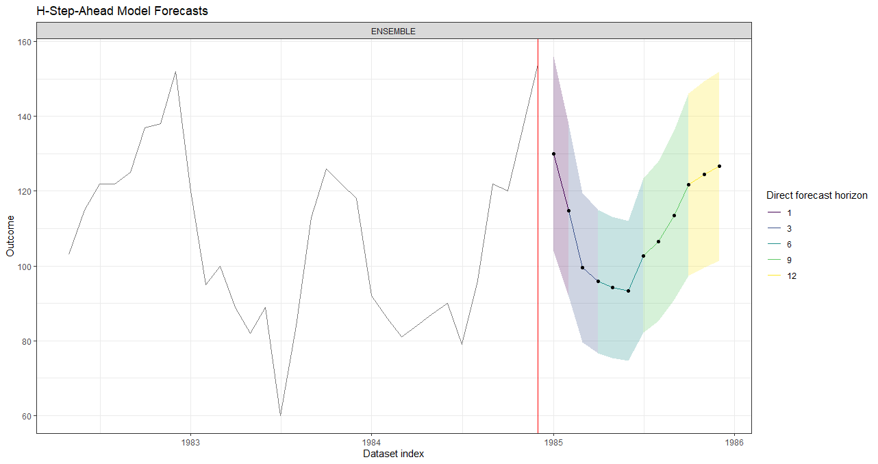 Below is a plot of 5 forecast models used to produce a single 12-step-ahead forecast where each color represents a distinct horizon-specific ML model. From left to right these models are: